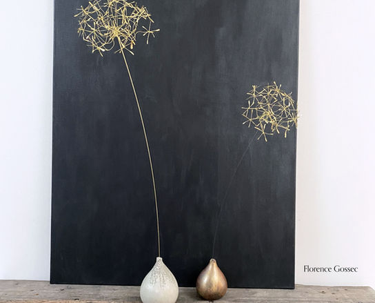 Orchidées sauvages, roseaux, glaïeuls, pivoines, hortensias... C'est une véritable promenade que nous propose Florence Gossec. Une promenade dans la campagne de son enfance. Entre ses mains, le laiton se courbe de mille manières pour représenter un style végétal nouveau et lumineux.