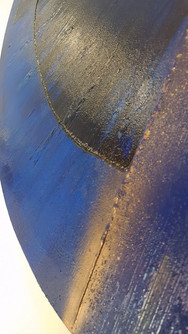 Ylda Decrop travaille sur châssis rond, avec de l’acrylique, de la bombe, des pigments poudre, de la résine et… des fibres végétales ! Ylda crée dans sa composition une impression de mouvement, grâce notamment à la fibre qu’elle positionne sans la contraindre, afin qu’elle puisse bouger librement, en douceur. Et pour moi le résultat est là ! La fibre de coco enroulée, les coulures de la résine, la brillance des pigments, la feuille d’or… tout cela apaise l'œil et donne une impression de préciosité.